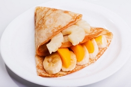Блин «Тропический» (ананасы консервированные, бананы, персики консервированные, кленовый сироп) |